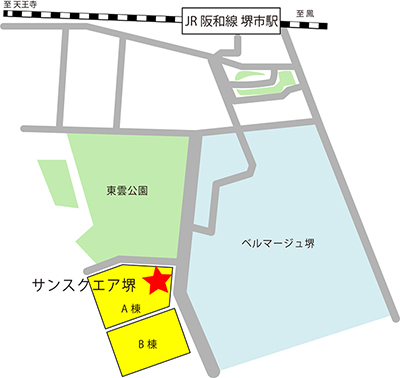 ![]() 電車でいらっしゃる場合 JR阪和線「堺市」駅 徒歩3分 南海バスをご利用の方 堺東駅から:15番乗り場より「阪和堺市駅前」下車 堺駅から:1番乗り場より「阪和堺市駅前」下車 お車をご利用の方 駐車場がございませんので、できるだけ公共交通機関でお越しください。 お車でお越しの場合は、近隣の有料駐車場をご利用ください。 |
