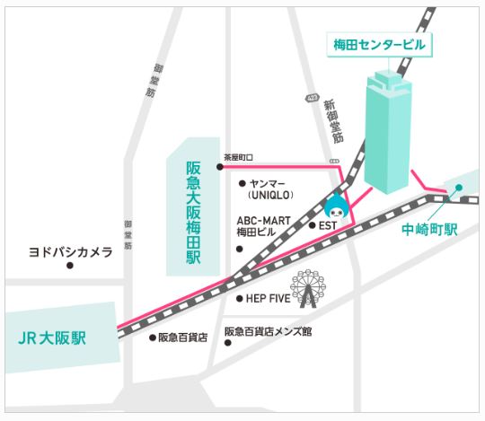 【4月24日(金)】梅田センタービル 32階 ・阪急大阪梅田駅 茶屋町口よりヤンマー(UNIQLO OSAKA)横歩道をまっすぐ ・地下鉄梅田駅・阪神大阪梅田駅 WhityうめだノースモールをHEP FIVE H-30であがり高架沿いにすすむ ・JR大阪駅 御堂筋口より阪急コンコースを通り抜けて高架沿いにすすむ |