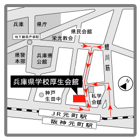 ![]() JR・阪神「元町」駅東口から、北へ約130m 神戸市営地下鉄「県庁前」駅東出口2から、南東へ約370m 阪急「神戸三宮」駅西口から、西へ約800m 駐車場はありませんので、近隣の有料駐車場をご利用ください |